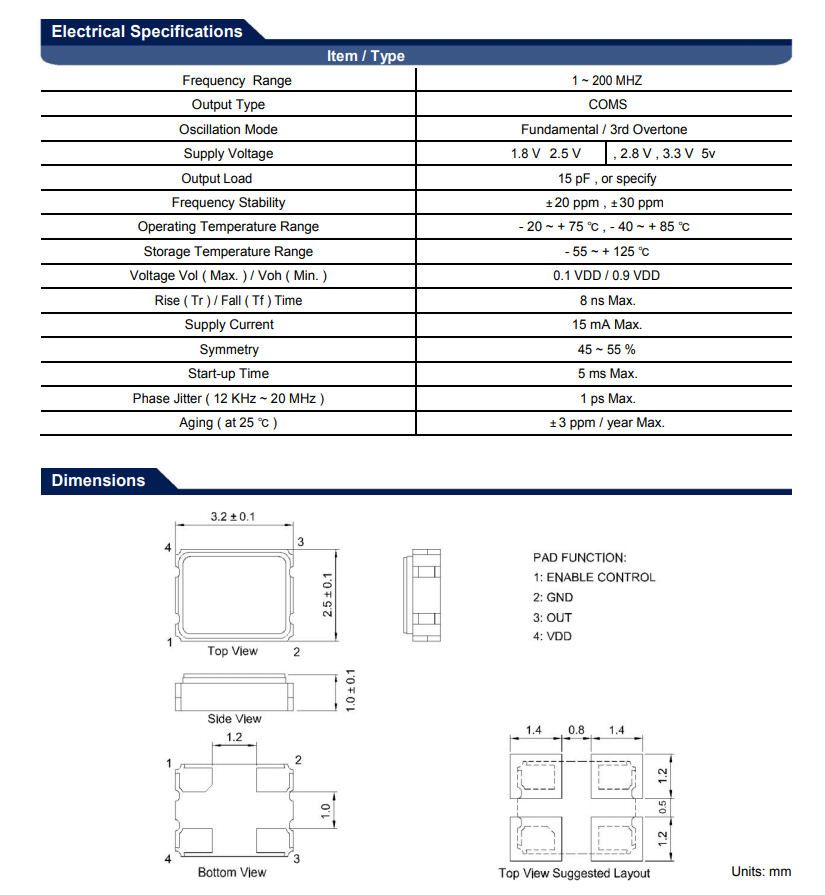 有源晶振3225,超小型SMD接縫密封時鐘晶體振蕩器單元;用于WLAN,藍牙,DSC,DSL和其他IT產品中的應用。